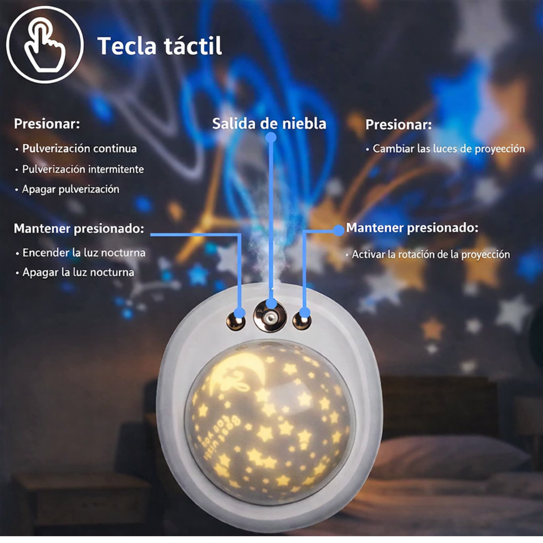 - ✨ Humidifica y proyecta estrellas.