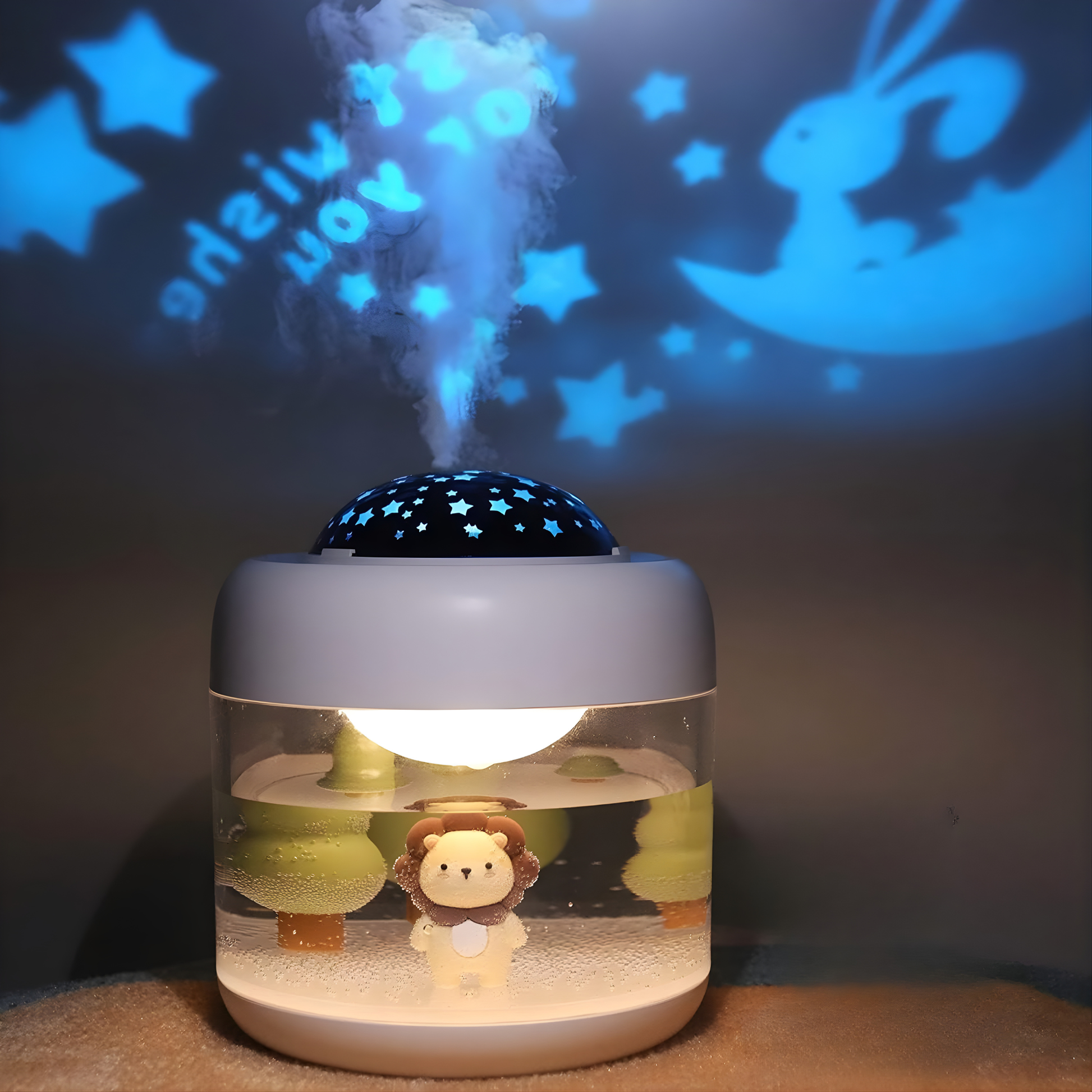Humidificador de niebla fresca con proyector integrado que transforma cualquier habitación en un cielo mágico. Hidrata el ambiente mientras proyecta estrellas y escenas encantadoras que estimulan la imaginación y acompañan el descanso de los más pequeños.